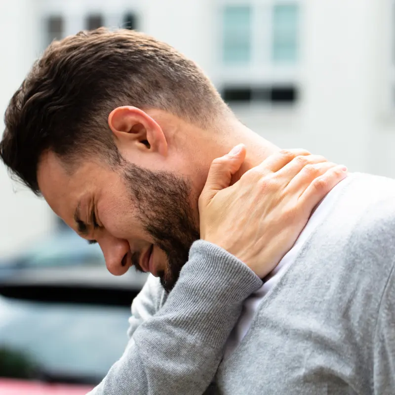 Overuse or sudden movements can strain or sprain the muscles and ligaments in your neck, causing pain. Activities such as lifting heavy objects improperly, sleeping in an awkward position, or even turning your head too quickly can lead to muscle strains or sprains.  In response to muscle strains, the affected muscles may go into spasms as a protective mechanism.  Muscle spasms can lead to increased tension and stiffness in the neck, contributing to pain.